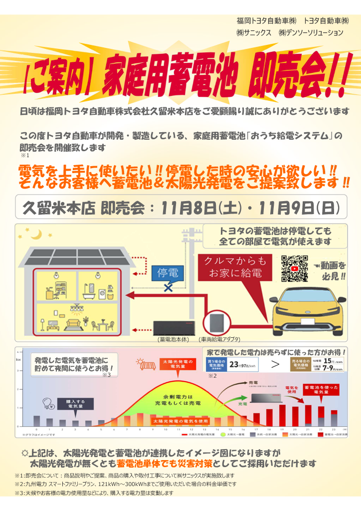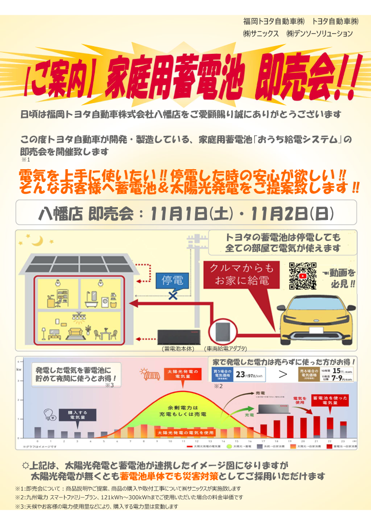 福岡トヨタ自動車株式会社様が開催する「創業82周年記念 感謝と恩返しの大創業祭!」の一環として、福岡トヨタ自動車株式会社様、トヨタ自動車株式会社様、株式会社デンソーソリューション様、そしてサニックスが連携し、福岡県内のトヨタ販売店にて、家庭用蓄電システム(おうち給電システム)の 即売会を実施します。